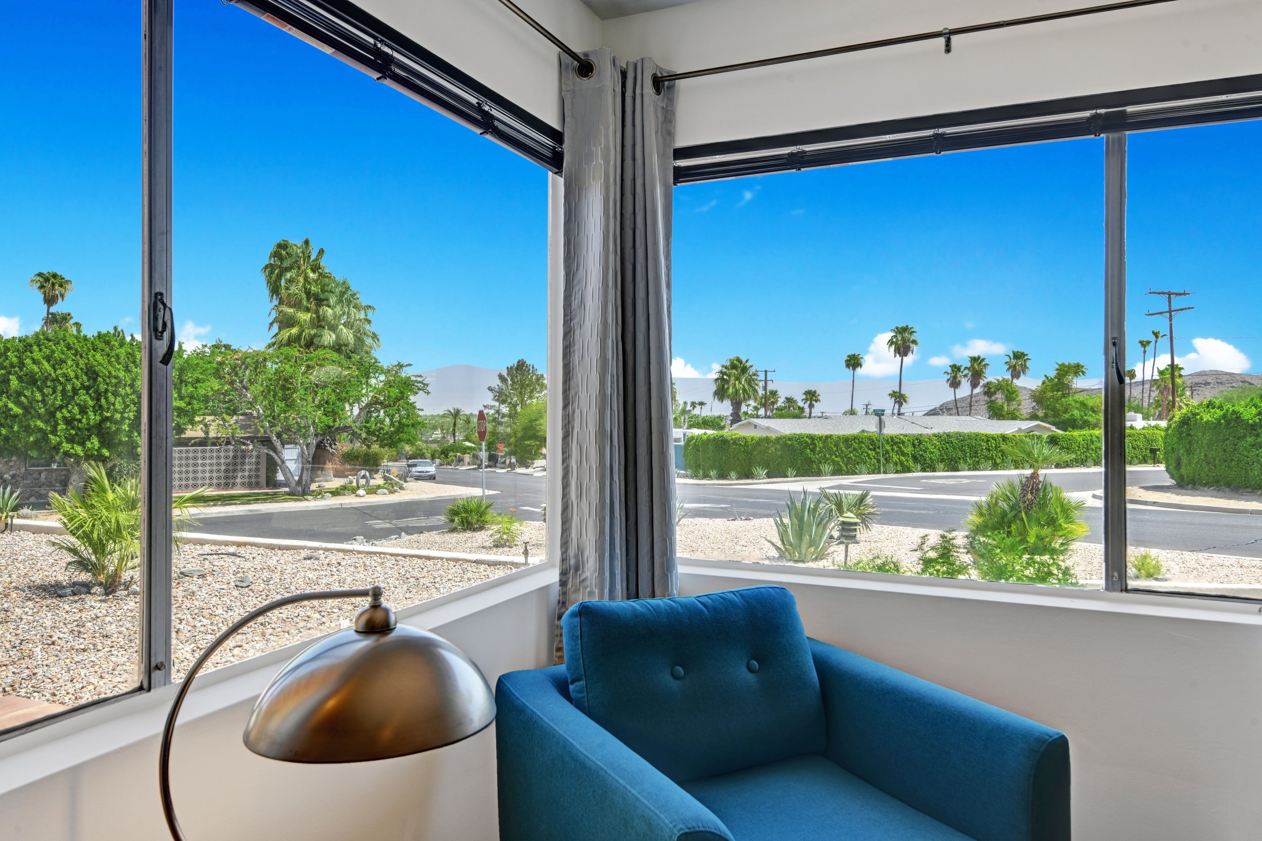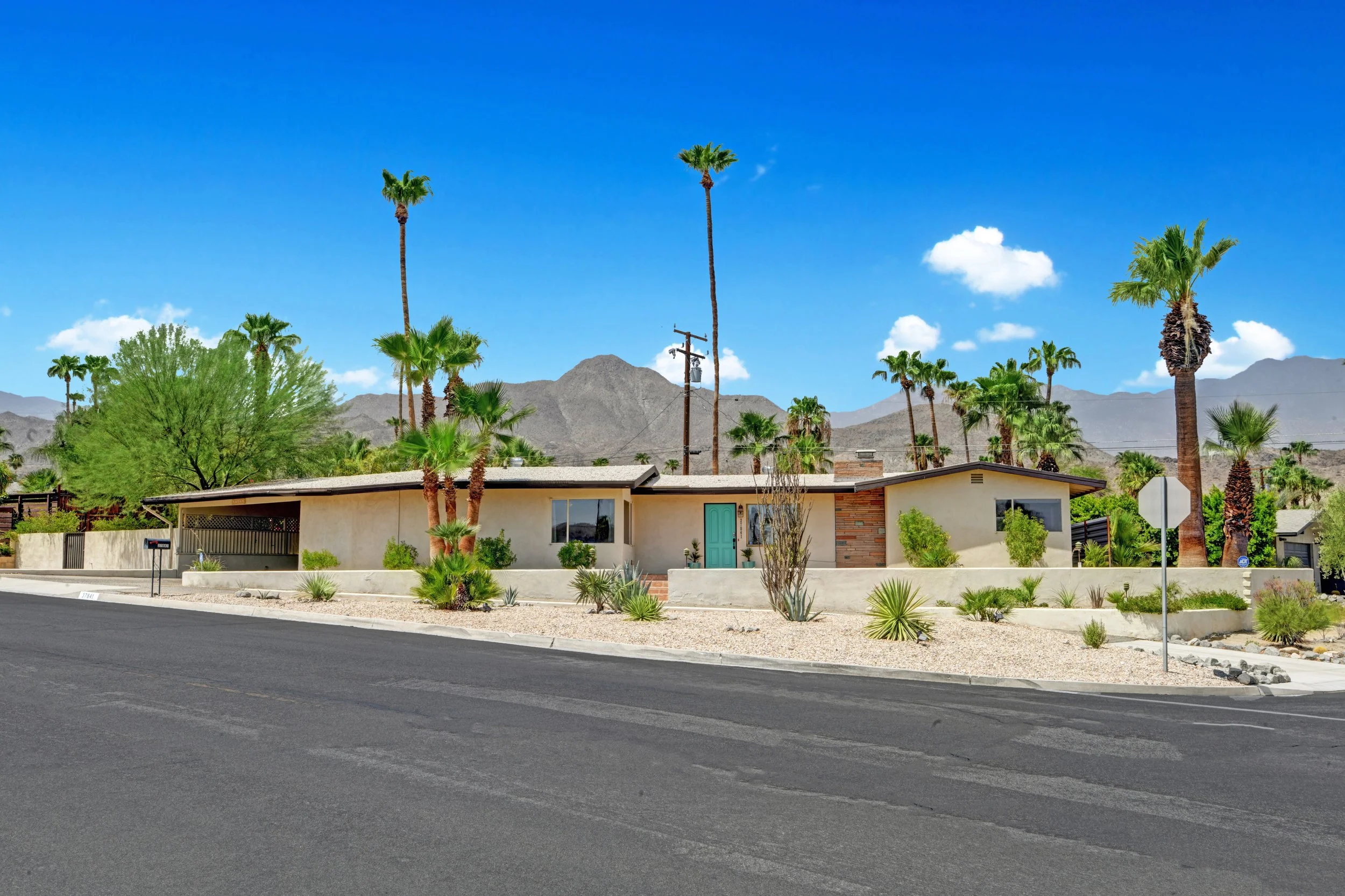 Beautifully sited on a large corner lot with mountain views in all directions, this 1955 gem offers classic, mid-century distinction. Design features include a large, well-proportioned corner fireplace in the living room, industrial-sash-style corner windows in the three bedrooms that frame majestic views of the valley and the mountains, iconic Roman brick chimney, carport with contemporary louvered screen wall, and a large, deep, stately swimming pool. Indoor-outdoor living is a breeze with direct access from the living and dining areas to the covered patio, pool, and expansive backyard. A spacious bedroom off the living room, and near the kitchen, is well-situated to serve as a home office, den or library, and also sports an adjacent “mid century” bathroom in near-mint original condition. Two additional ample-sized bedrooms, one ensuite, have good separation for privacy and are bathed in cozy natural light, with views to the mountains. The kitchen is well-configured and bright with oodles of counter space, storage and direct access to the pool and backyard. Walk-in closets, laundry room, and a “workshop” off the carport are additional features that add to the immense appeal of the property. 37841 Palo Verde Dr is located in the Cove neighborhood, a highly-desirable, eclectic community nestled against the mountains, and conveniently located between Palm Springs and Rancho Mirage. Excellent nearby hiking trails abound. Shopping, dining, drinks, and entertainment are all within a short drive.