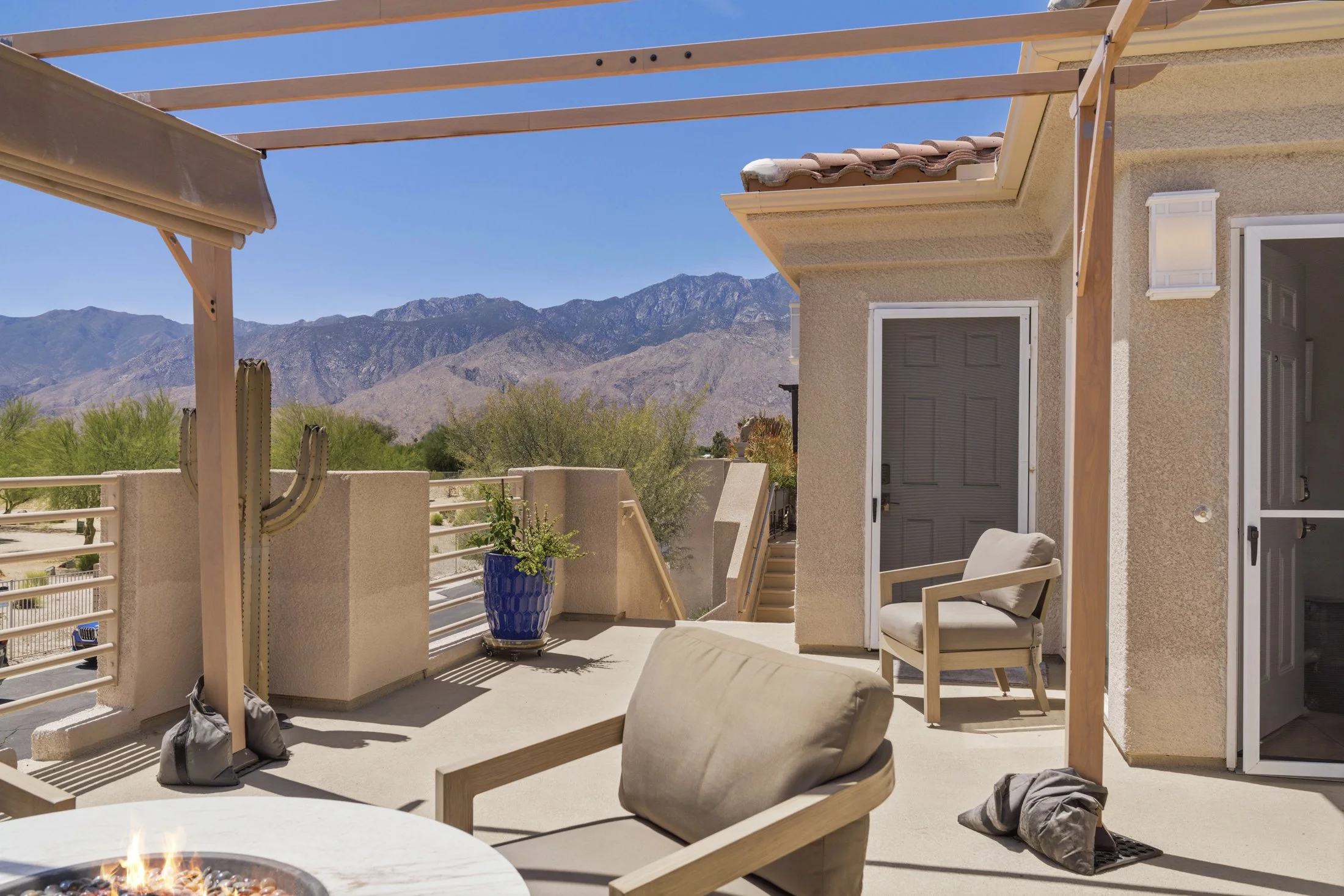 Perched on the second floor with commanding mountain views to the south and west, 67694 Duke Road #204 is move-in ready with recent bath remodels, high-end carpeting, designer paint, and so much more! The open layout is light-filled and spacious, and the open concept kitchen is decked out with a stylish tile backsplash, and has oodles of storage. Consider the large entry deck an outdoor room with spectacular mountain views, and ample winter sunshine. A separate entry to the guest bedroom and bath allows flexibility and additional privacy for you and for your guests. For golfers, both the Cimarron and Desert Princess courses are close by. Inside (side-by-side) laundry and a double-car garage are conveniences rarely found at this price point. Close to shopping, biking, and plenty of dining options.
